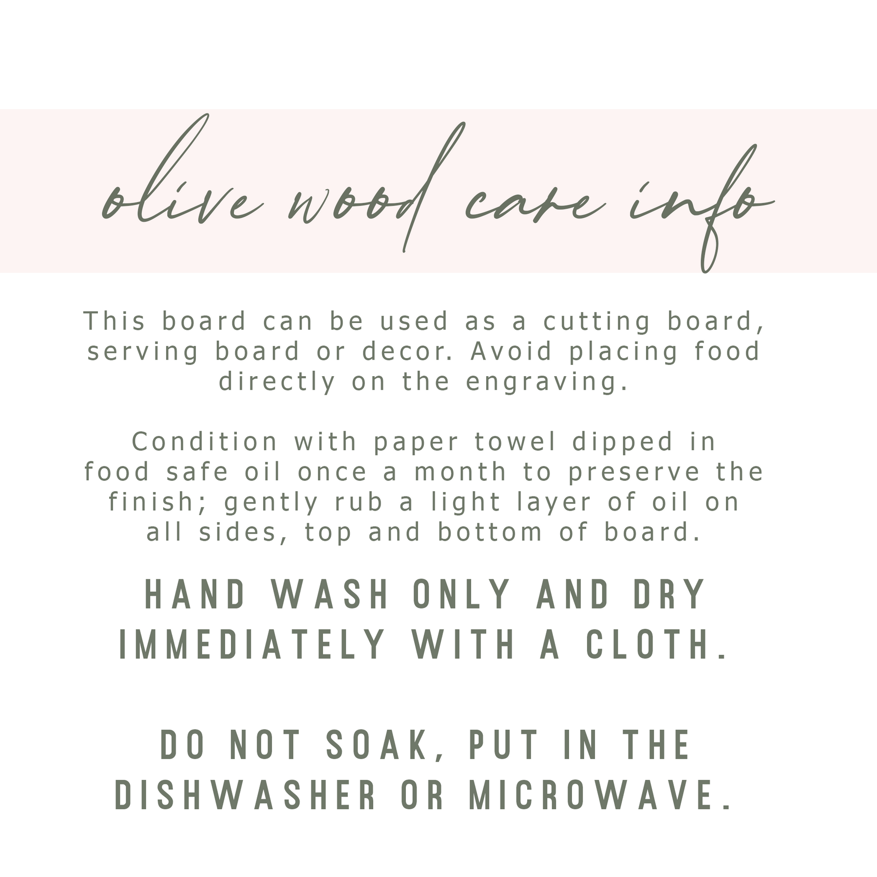 Hand wash only and dry with a towel immediately. Condition with paper towel dipped in olive, peanut or sunflower or any food safe oil once a month to preserve finish; work oil into sides, top and bottom of board using gentle circular motion.